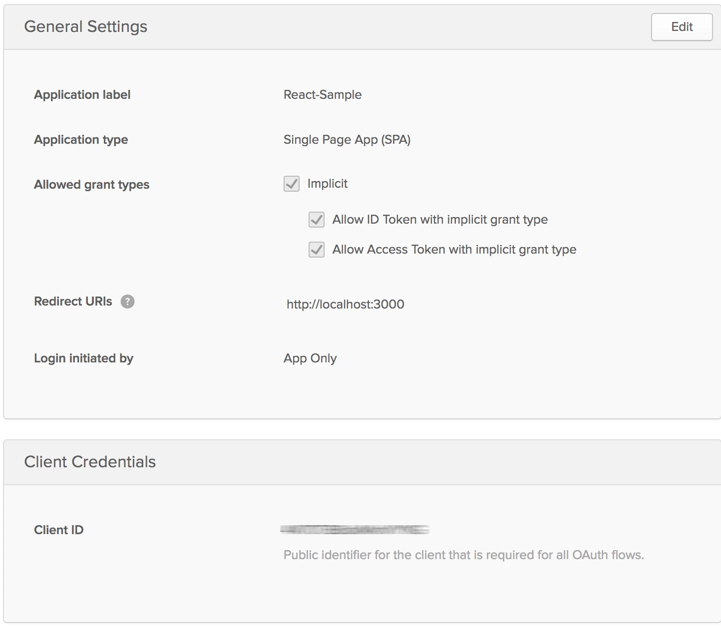 So log in to your Okta account, [or create one](http://developer.okta.com] if you haven’t yet. Navigate to Admin > Add Applications and click on the Create New App button. Select Single Page App (SPA) for Platform and OpenID Connect for the sign on method. Click the Create button and give your application a name. On the next screen, add http://localhost:3000 as a Redirect URI and click Finish. You should see settings like the following.