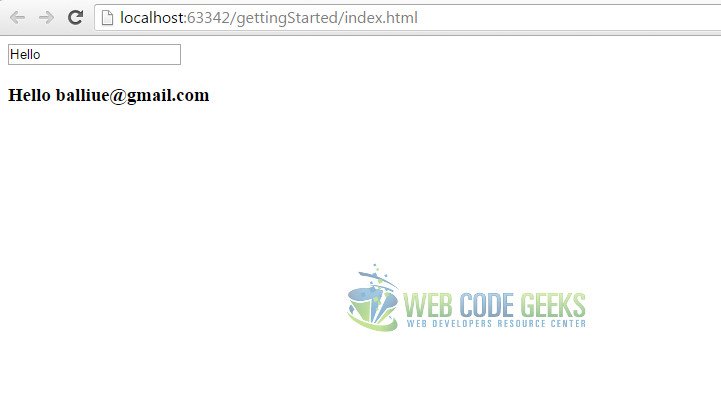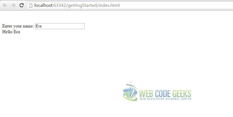 The important part of this piece of code is the <body> section. There is the Angular app that we have defined, by putting ng-app="myApp" inside the <body> tag. That means that we have named our app myApp. After doing that, we have placed an input field that has two attributes appended to it: type and ng-model, the former taking the value text while the latter name. We bind the value of the input to the variable name using the attribute ng-model. To show the value of name in the view, we put {{name}} in the HTML, so basically we bind the value of the name to the view. Angular treats the double {} brackets as a template and keeps the value updated as the input tag changes.