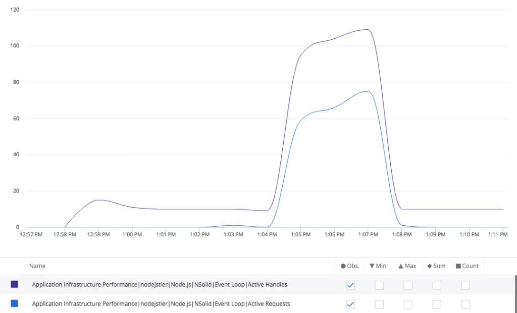 Figure 1. N|Solid Metrics, available from the AppDynamics metric browser, provide additional visibility into event loop activity and other indicators of Node.js process health