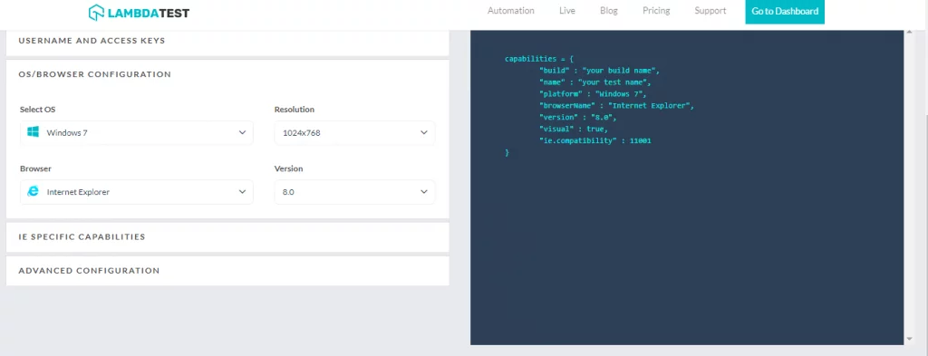 For demonstration, we port the earlier example that used the pytest framework to remote Selenium Grid on LambdaTest. We perform the tests using IE 8.0 on Windows 7 and Microsoft Edge 15.0 on Windows 10. The capabilities can be generated using the LambdaTest’s Desired Capabilities Generator. Select the appropriate browser & OS versions and generate the capabilities for Python programming language.