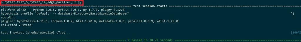 We have a look at another example of Selenium automation testing where the test framework used is Pytest. The framework can be installed by executing the command pip install pytest on the terminal. If you plan to take advantage of parallel execution, you can install the pytest-xdist plugin using the command pip install pytest-xdist. We make use of @pytest.fixture decorator with scope as a class to pass IE & Edge browsers as arguments. Since two browsers are used in the test, we use the command pytest -n=2 so that execution of IE & Microsoft Edge browser can occur in parallel.