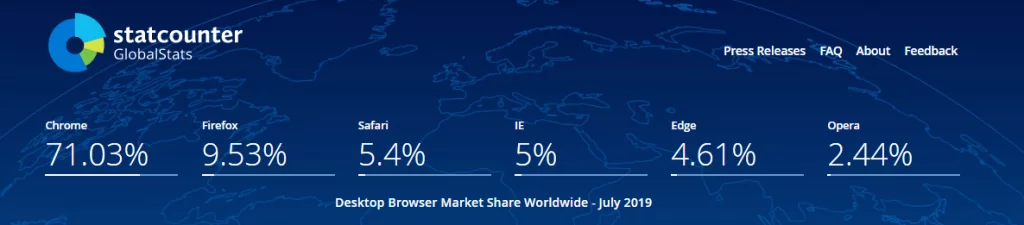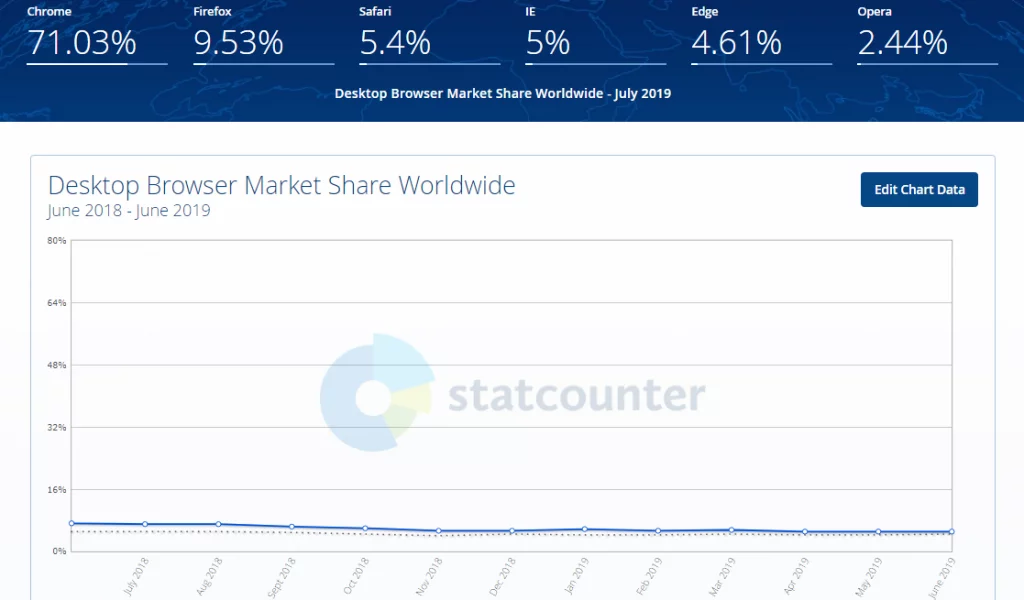 IE might not be the most preferred browser from a web-development & design point of view but there is still a significant percentage of users that makes use of IE. As per Desktop Browser Market Share Worldwide, IE as of July 2019 holds a 5% market share in the web browser market which is a good number considering the overall number of internet users worldwide.